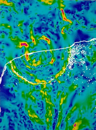 The coastline is shown as a white line. A striking series of concentric features reveals the location of the crater. White dots represent water-filled sinkholes (solution-collapse features common in the limestone rocks of the region) called cenotes after the Maya word dzonot. A dramatic ring of cenotes is associated with the largest peripheral gravity-gradient feature. The origin of the cenote ring remains uncertain, although the link to the underlying buried crater seems clear.