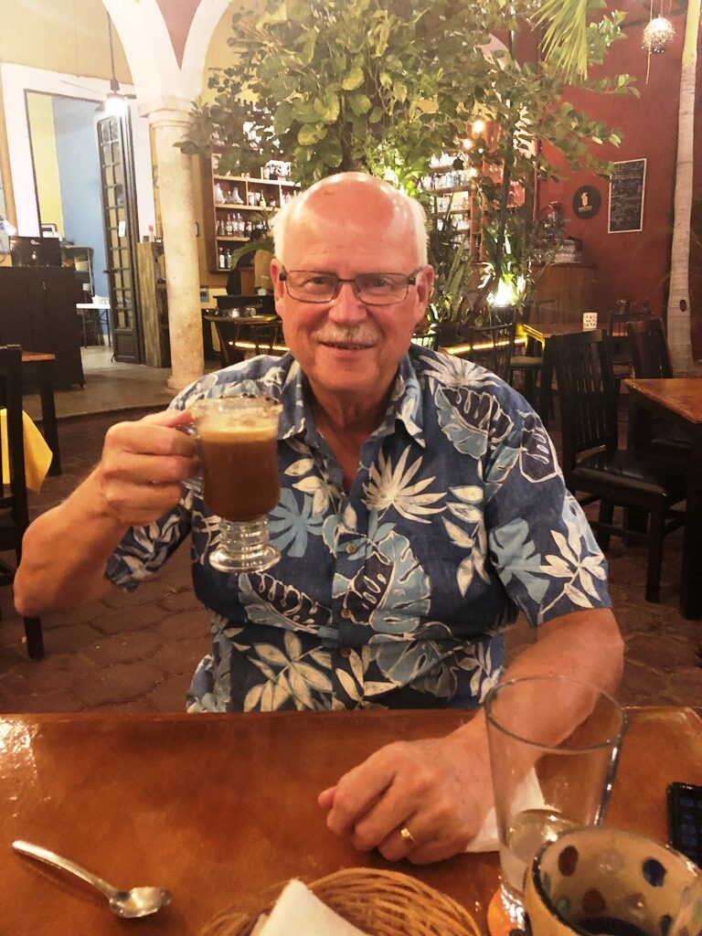 Amaro’s stage… we were there too early for live entertainment!We were warmly welcomed, once again, by Victor…… who took a pic for us!My lovely lady about to enjoy Pollo X’Catik, our favourite!We took a minute to capture the moonrise!Victor preparing our Cafes Maya…… and me enjoying mine!A pose with one of the other long-time “camareros”!
