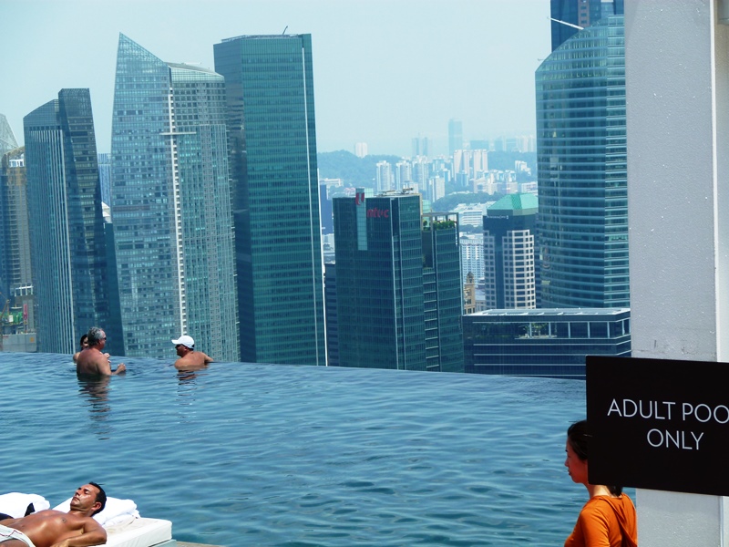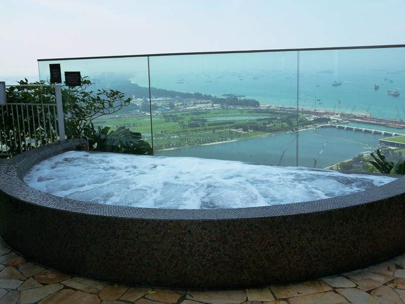 While we were at the Sands Hotel on Monday, I took this picture of their ‘infinity pool’ at the top of the hotel overlooking the city. The other picture is of one of the several hot tubs overlooking the harbour!