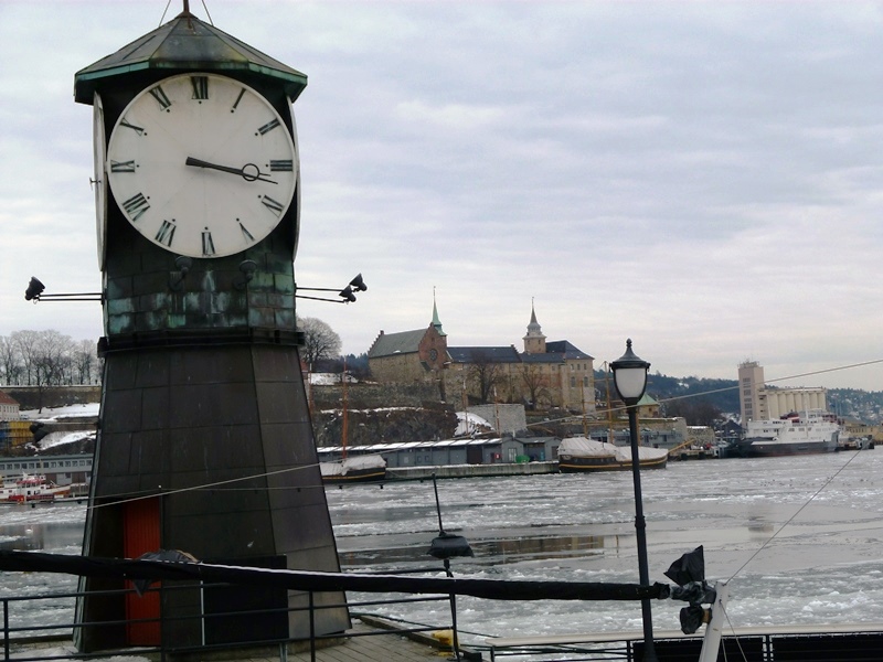 Ray enjoying Oslo!who needs a watch? that’s the Akershus Fortress in the backgroundtaking pictures of…… the fortressAker Brygge is the place for shopping and restaurantslots of ice on the harbourtime for a warm beverage inside in the mall!