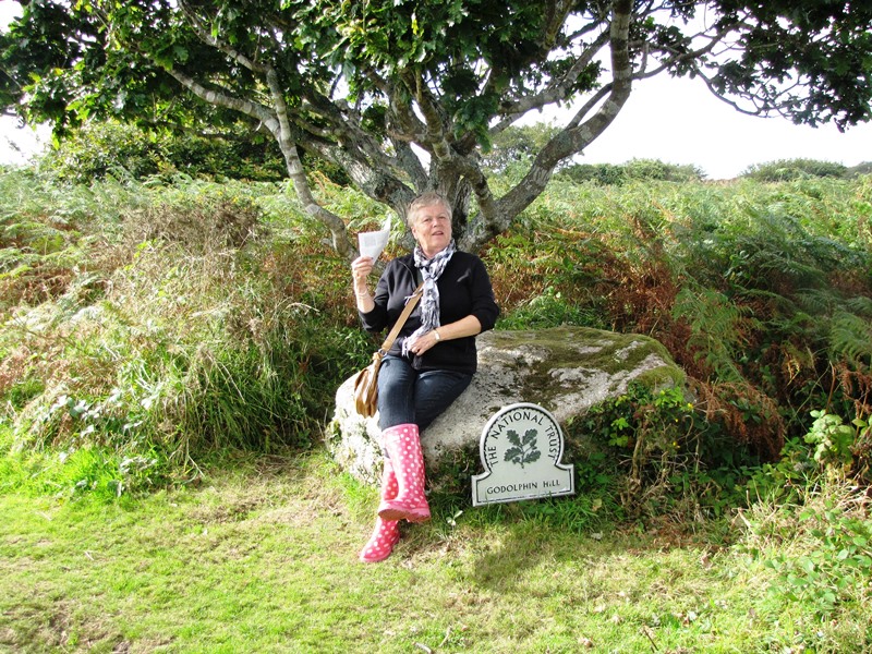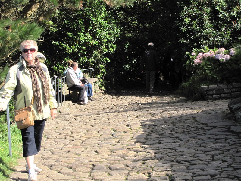 After our lunch, we said goodby to Marazion and St. Michael’s Mount and headed down the area of Cornwall called the Lizard. On our way down the peninsula, we discussed options of where to go and Elaine said that her feeling was that we should head to Kynance Cove. Sporting her new ‘wellies’, we’re ready to walk down, down, down from the car park to the cove.
